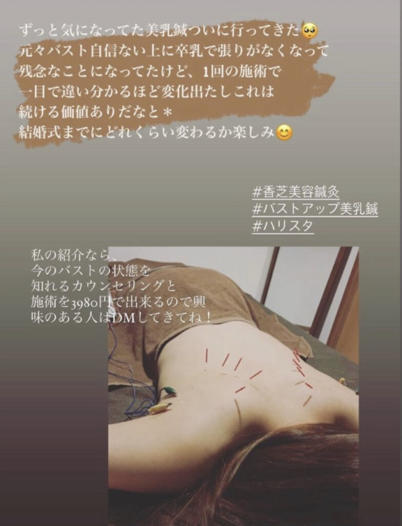 「何回か施術を受けた後、バストのサイズがワンカップ上がったと感じました。特に胸元のボリュームが増えた気がします。肩首背中にも鍼灸をしてもらえてとても楽になりました!さらにHARISTAはか問いやすい料金設定で無理なく続けられるので安心です。」